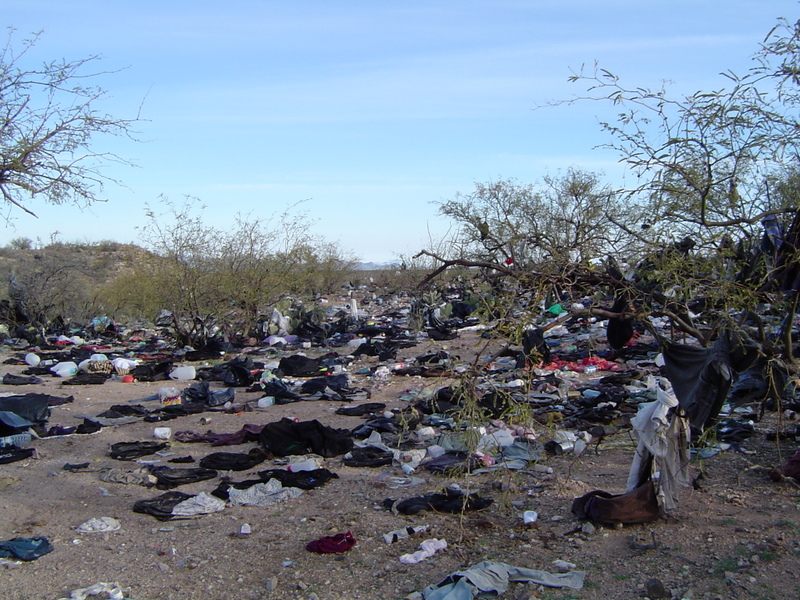 No matter which side of the immigration debate you’re on, it’s hard to deny the absolute and terrible damage being done to our desert ecosystems in Arizona. These are not isolated eyesores. Anyone who has been to southern Arizona can find mountains of trash. Trails cut into fragile desert areas, due to the foot traffic inflicted by tens of thousands of people heading north. “Lay-up” areas have been found in wilderness areas as far north as Phoenix and beyond. I have found trash just south of Florence. It is no exaggeration to say that there are washes full of trash that measures knee-deep. Not to mention the “rape trees” - trees decorated with ladies’ undergarments, victims of rape - trophies for the coyotes. For pictures of garbage, trails, abandoned vehicles - visit Desert Invasion.